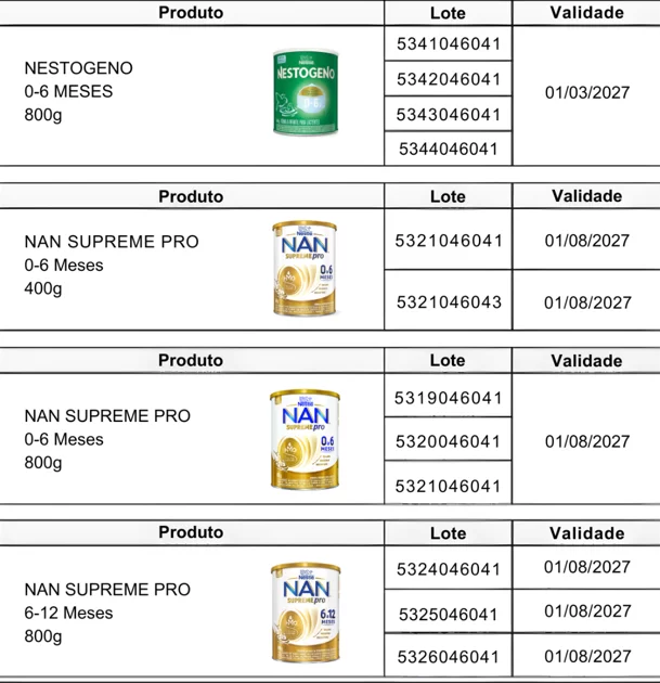 Consumidores que utilizam fórmulas infantis das marcas Nestogeno, Nan Supreme, Nanlac Supreme, Nanlac Comfor, Nan Sensitive e Alfamino devem verificar o número do lote impresso no rótulo do produto. Caso o lote corresponda àqueles incluídos no recolhimento, o produto não deve ser utilizado nem oferecido à criança. Os demais lotes não foram afetados.